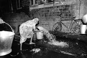 Someone, somewhere inside the place is pocketing several hundred Rupees a month to turn on a standpipe or a tap or a hydrant for just thirty minutes. When that first bore of water roars down the pipes, the street is literally galvanized into activity. For thirty minutes, and not a spare second more, the pavement dwellers of Apna Jhopadpatti will fill every bucket, man, woman and child. Like a chain of firefighters fighting some imaginary fire, they perform as a team, in relays, ferrying the precious liquid, from its sudden fount to their huts. Water will be poured from smaller to larger containers until each household has its allotted ten gallons, enough to see it through the day.