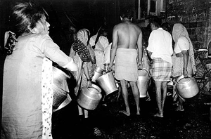 Then, in convoy they pad up the road to the place. Others steel out of shadows, off charpoys, (Indian rope beds) peel away the PVC sheeting they hang from their roofs and under the legs of their charpoys in the streets to keep out unwanted night visitors such as monsoon showers. Like some silent flotilla they head up, everyone carrying some form of vessel that can carry the precious liquid. These are stacked in prearranged order, like motor racing cars on a grid waiting for the starter to flash the starting flag to signal the "OFF."
