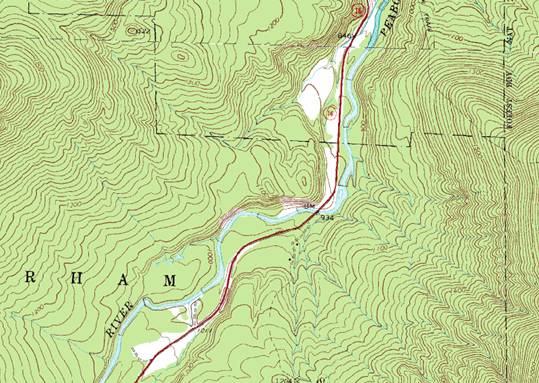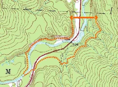 2. Using the topographic lines on the map, draw in the area that would be flooded following dam construction (Figure 3). Using graph paper as an overlay, measure the surface area of the reservoir created. Count the number of structures and roads and the area of agricultural, forest and other open space that would be flooded.