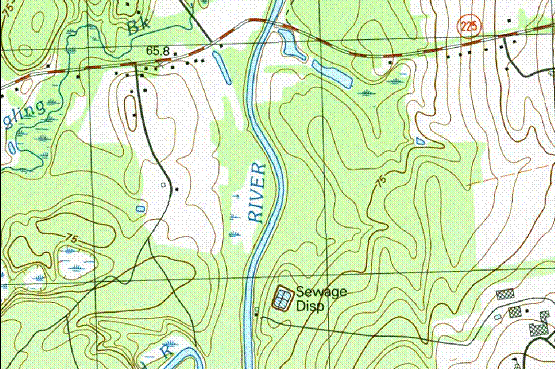 Using a United States Geological Survey Topographic Quadrangle (USGS Quad; available from TOPOZONE for the United States and as ordinance surveys for much of Europe), evaluate a chosen reach of the river for suitability of dam locations. Methods: 1. The area with the greatest topographic relief, that which allows for the greatest storage volume and an increase in storage area of 15 meters (45 feet). Figure 1 shows two sites, one with steep slopes that would allow for dam construction, the other with little change in elevation, requiring an impracticable length of dam. After finding the steepest site, draw in the dam, extending it perpendicularly to the river until you reach the required height (see Figure 2).