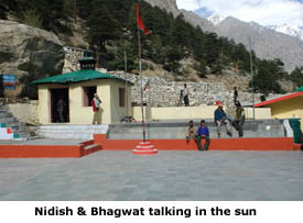 "Anshuman thanked Kapil rishi and headed back to his father’s kingdom, the bearer of both good and bad news. King Sagar was shocked and saddened at the stupid behavior of his sons and went off into the forest to meditate, without much result. He died, his son and his grandson also meditated and in turn died, and now we come to his great-grandson Bhagirath, who also meditated right here where we’re sitting. Bhagirath performed his tapasya standing on one leg for a thousand years on a rock said to lie under the present-day temple."