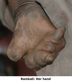 pulls back her left sleeve. Her entire hand is deformed by leprosy: she’d
