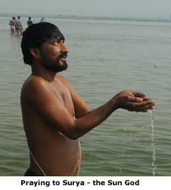 prayers waist deep in the river. Hands cupped, eyes closed, they pray to Ganga, Surya, to Shiva, Vishnu and