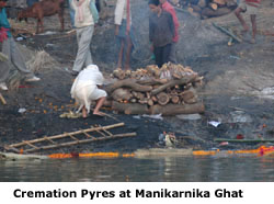 to the edge of the water. A cremation pyre is built, the body bathed in Ganga