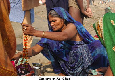mantras for his customers at his stand here at the head of Asi Ghat. He gives