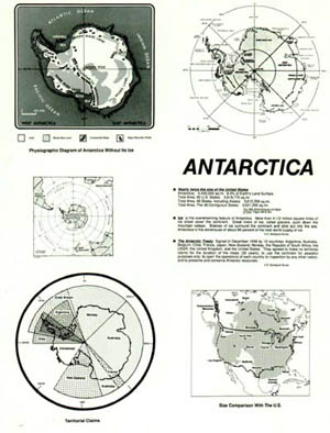 Antarctica Includes two views as from space over the South Pole, size comparison with the U.S. boundaries of territorial claims by eight nations, and a physiographic diagram of the continent without its ice. Size: 22" x 17" wide Antarctica Laminated Item# 3017L - $18.00