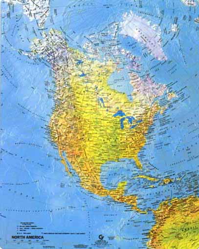 North America Political Map Shows ocean depths and land relief. Colors show the difference between humid, tropical, and temperate zones. Size: 37" x 29" wide Projection: Mercator